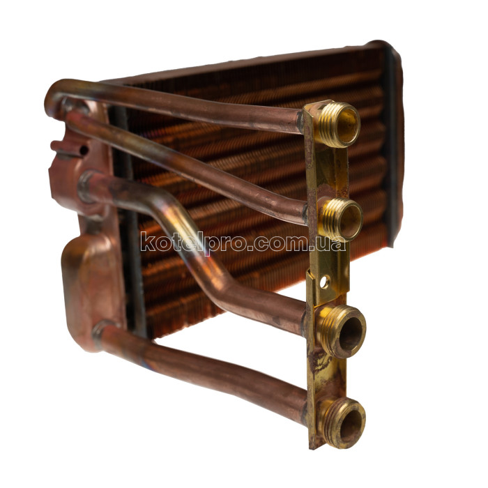 Бітермічний теплообмінник має унікальну форму та конструкцію, яка не характерна для жодного з торгових брендів газових котлів на ринку України. Він поєднує в собі два контури для нагріву приміщень та гарячого водопостачання, що робить його незамінним компонентом системи опалення.